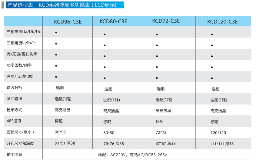 根据开孔尺寸不同,分为KCD96C3E、KCD80C3E、KCD72C3E等型号。KCD系列仪表主要供成套盘柜厂使用。具有高可靠性、经济性。