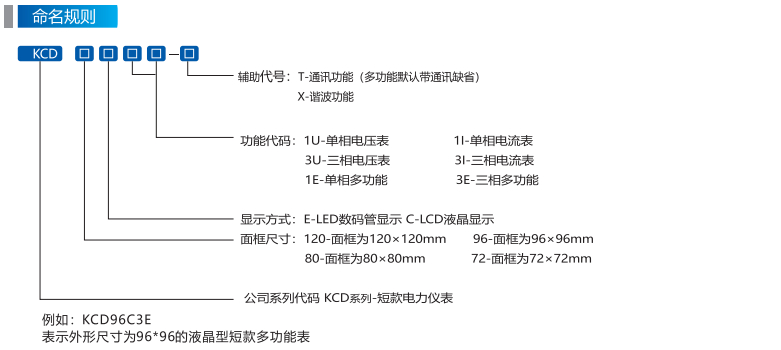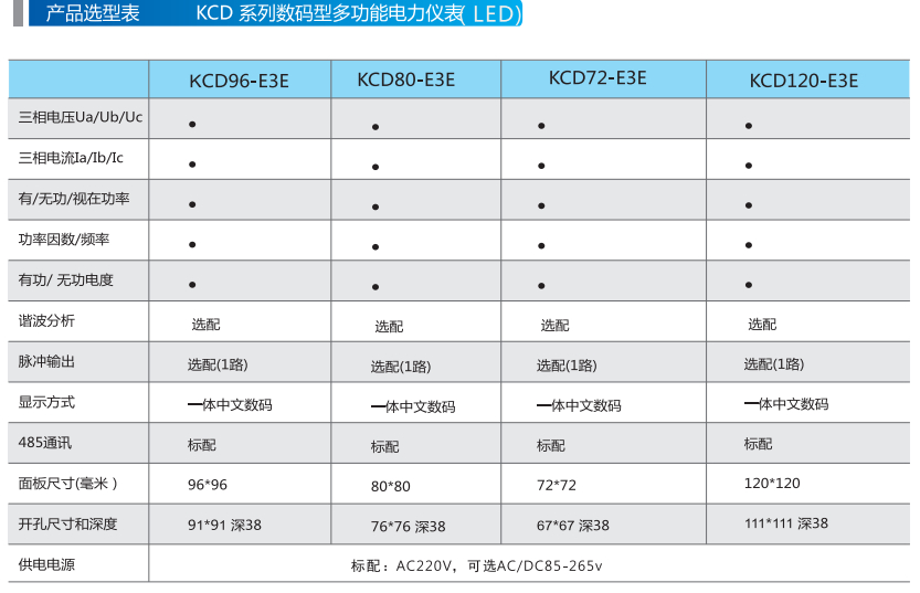 根据开孔尺寸不同,分为KCD96E3E、KCD80E3E、KCD72E3E等型号。KCD系列仪表主要供成套盘柜厂使用。具有高可靠性、经济性。