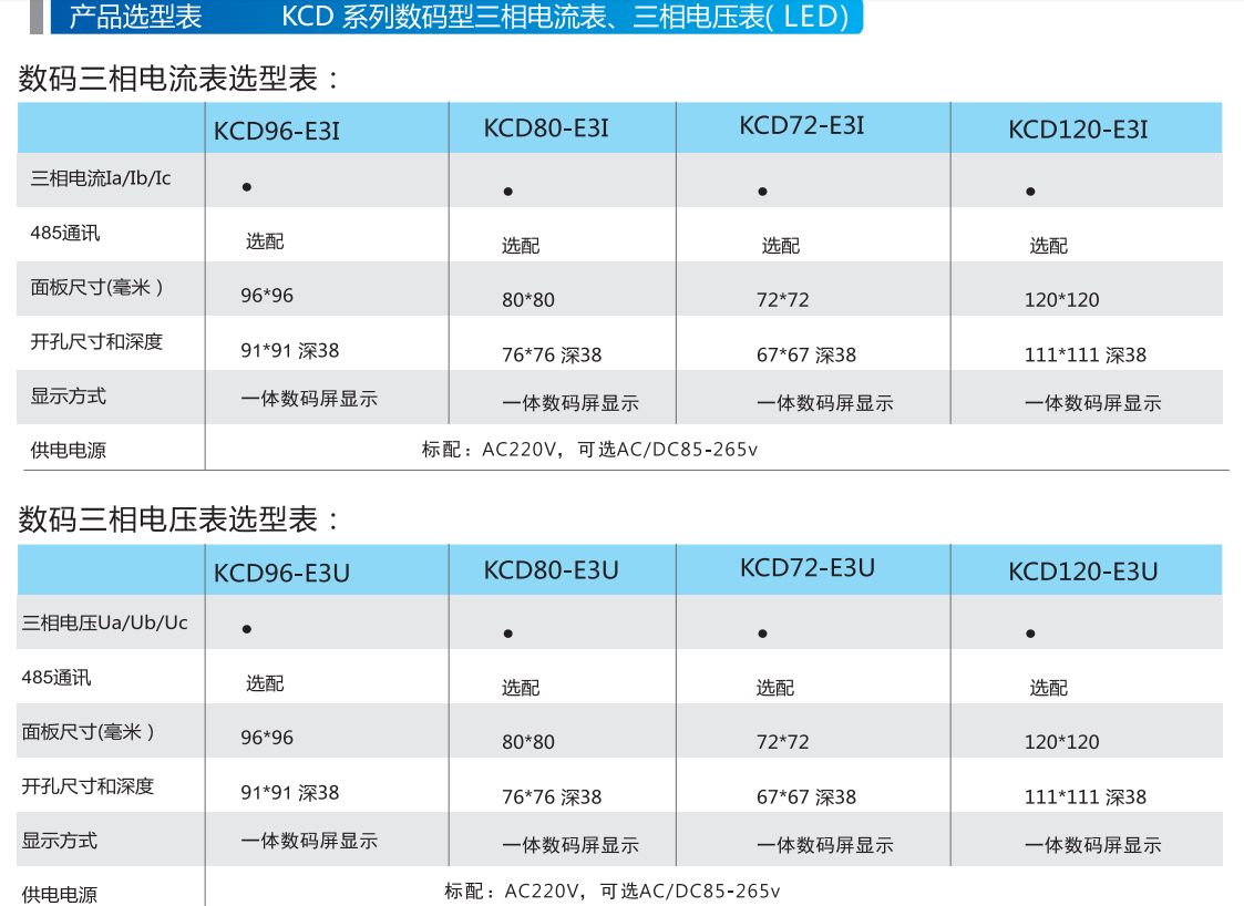根据开孔尺寸不同,分为KCD120E3U(I)、KCD96E3U(I)、KCD80E3U(I)、KCD72E3U(I)等型号。KCD系列仪表主要供成套盘柜厂使用。具有高可靠性、经济性。